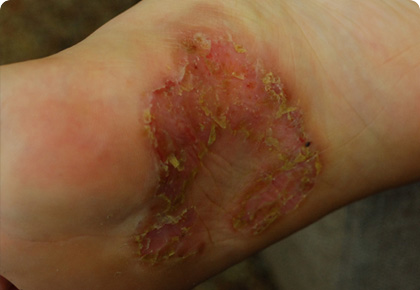 주로 손가락, 발가락 끝 부분에서 작고 투명한 수포가 발생하여 점차 퍼지면서 피부가 손상됩니다.