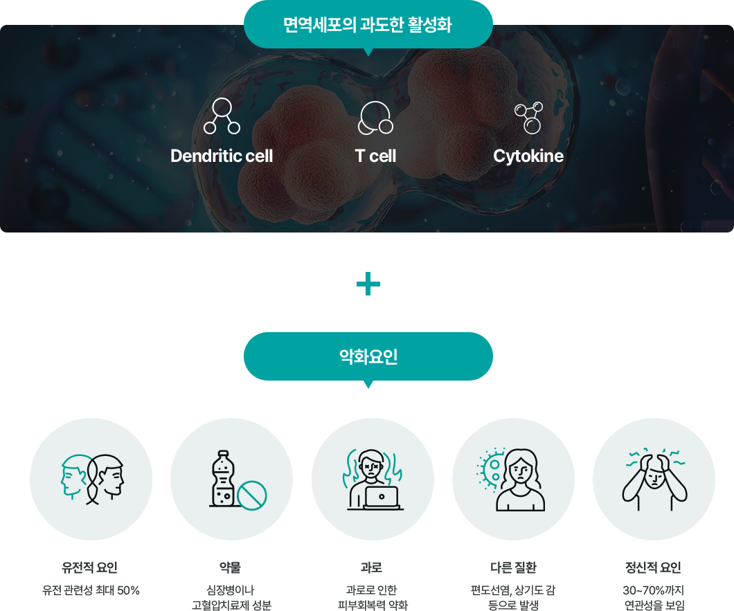 유전적 요인, 약물, 과로, 피부 손상, 스트레스 등이 영향을 미치는 것으로 판단하고 있습니다.