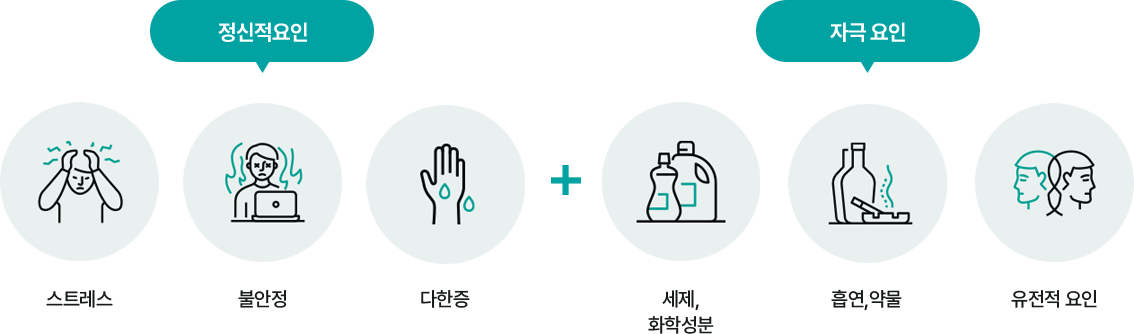 스트레스, 불안정과 같이 정신적인 요인과 땀이 많이 나는 다한증과 연관성이 있습니다.